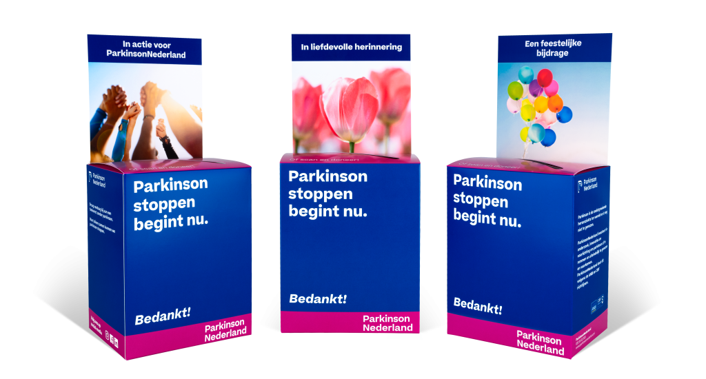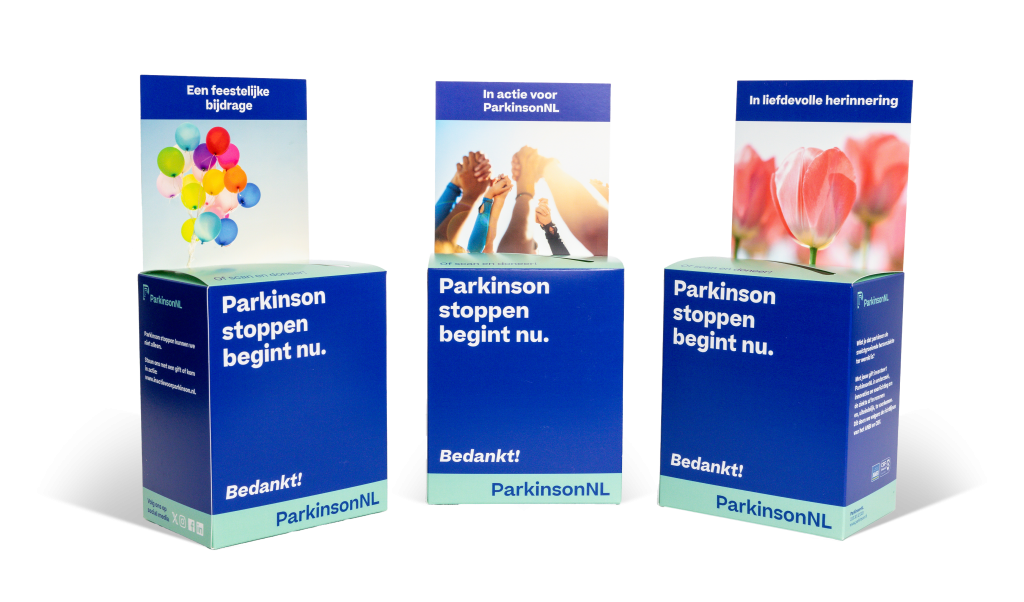 Vraag de donatiebox aan via onderstaande link. Wij sturen deze dan naar je toe. Je vouwt hem zelf uit als box, plaatst de box op een goede plek en je vertelt iedereen dat er kan worden gedoneerd. Zo kun je in een paar simpele stappen donaties inzamelen voor ParkinsonNederland. In liefdevolle herinnering of als vervangend cadeau voor je verjaardag. En heeft iemand nu geen geld op zak? Op de donatiebox staat een unieke QR code waarmee gemakkelijk via Tikkie betaald kan worden. De gever bepaalt zelf het bedrag. Door deze QR code weten we precies dat deze giften bij jouw actie horen.