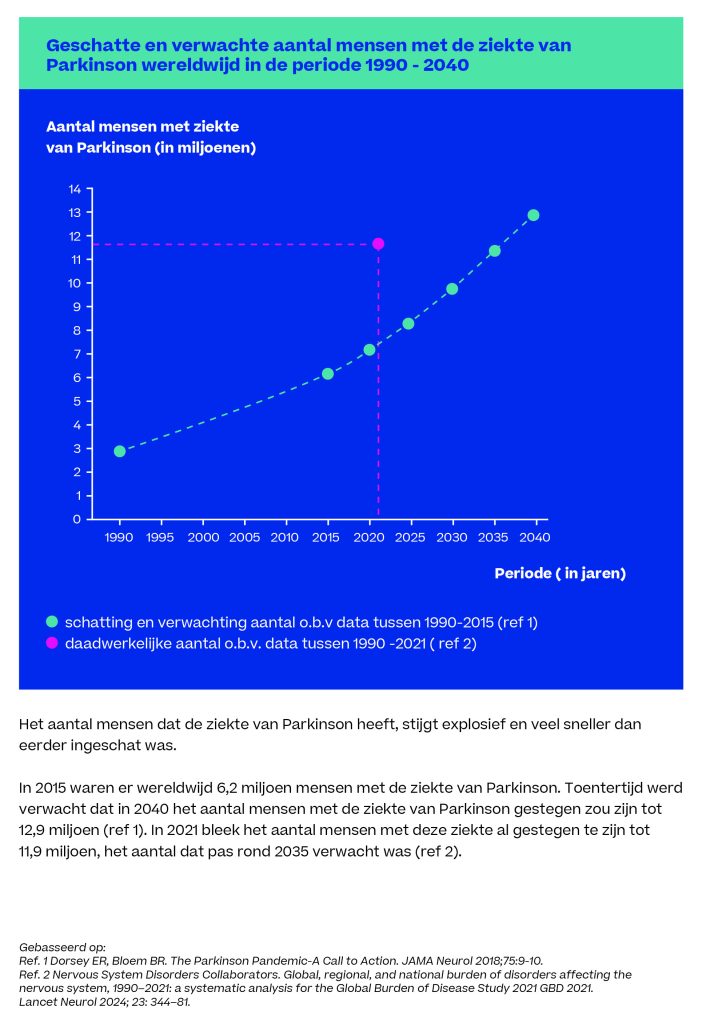 Parkinson* is wereldwijd de snelstgroeiende hersenziekte — en die groei gaat nog veel sneller dan eerder werd aangenomen. Nieuwe cijfers laten zien dat het aantal mensen met de ziekte van Parkinson of een atypisch parkinsonisme in een ongekend tempo toeneemt. In Nederland steeg het aantal mensen met de ziekte van Parkinson tussen 2010 en 2021 al met 30%. Mede als gevolg van een vergrijzende bevolking en toegenomen overleving, zal het aantal mensen met de ziekte van Parkinson minstens verdubbelen tussen 2018 en 2040. Recente analyses wijzen erop dat deze groei fors wordt onderschat.