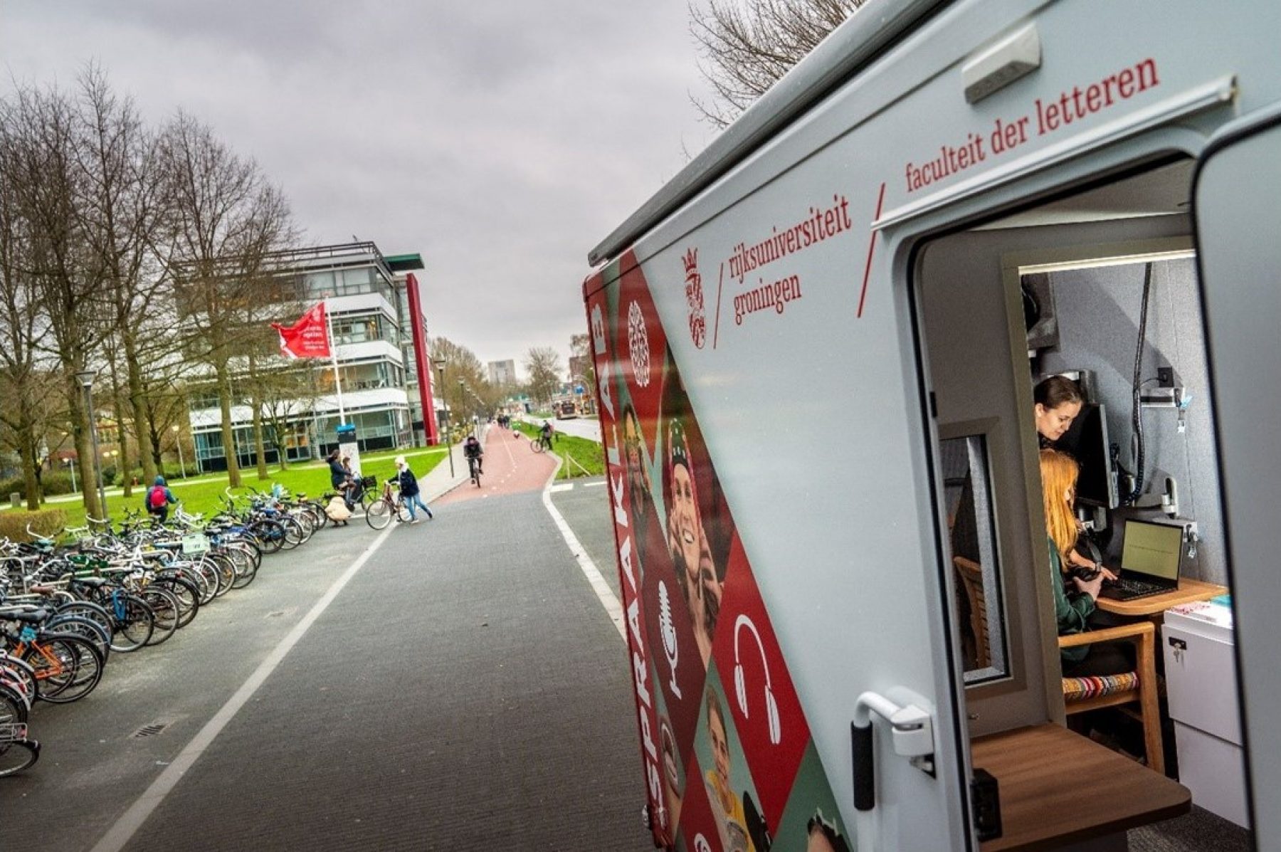 Voor deze studie konden de deelnemers ook thuisblijven: Teja kon namelijk gebruik maken van SPRAAKLAB, het mobiele laboratorium van de Faculteit der Letteren. (Foto copyright: Reyer Boxem)